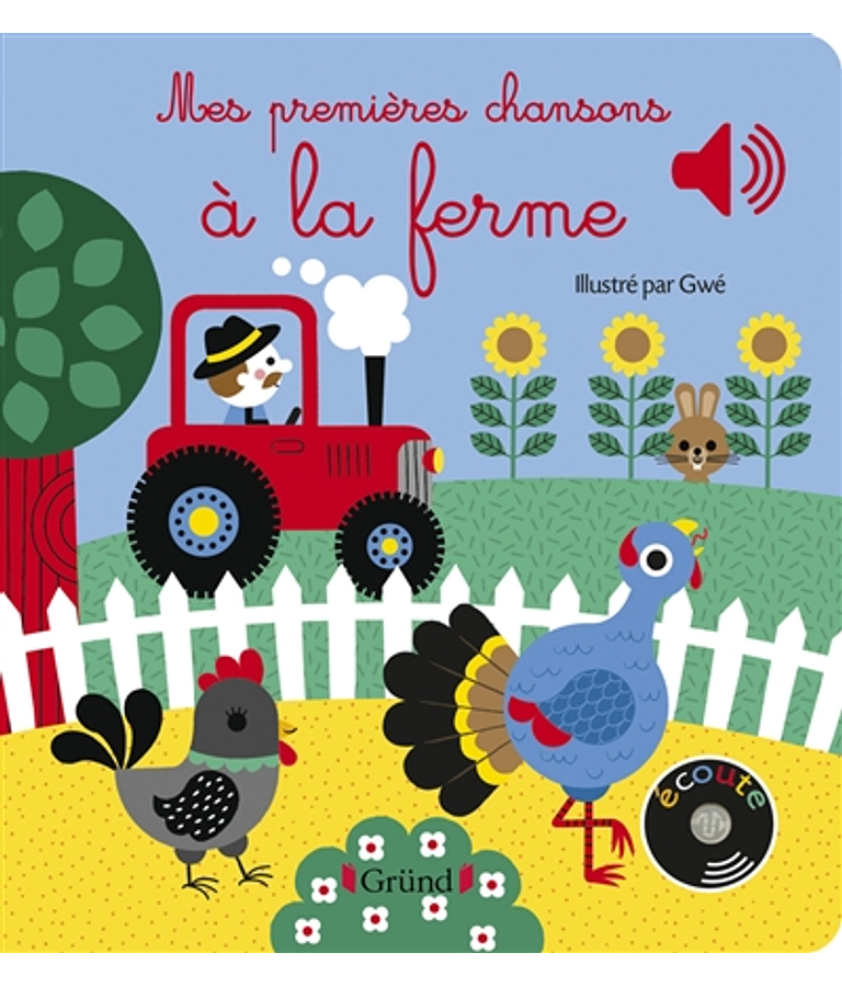 Une découverte de l'univers de la ferme en musique grâce à des puces sonores qui permettent d'écouter Dans la ferme de Mathurin, Mon petit lapin, Un dindon se dandinait, Le canard dit à sa cane, La laine des moutons et Une petite poule grise.